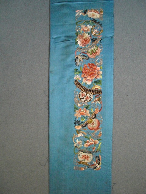 Sleevebands are embroidered in a variety of stitches. The most usual are satin, split, stem, back and Peking Knots , overlaid and scale stitch. Peking Knots also known as Forbidden Stitch were never actually forbidden by law but probably got this name because they were first worked in the Forbidden City. The fineness of Peking knots varies considerably and it is only occasionally that a really minute stitch is seen. In some stitches two colours have been twisted together to great effect. Couching is where a thread, in this case gold spun round a silk core, is caught down on the surface of the fabric by another stitch, often coloured .