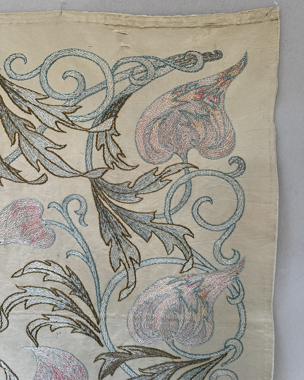 The rich gold sateen ground embroidered with large pink and mauve tulips, with touches of coral coiled within acanthus leaf stems, in shades of pale blue and cream, greens and browns.