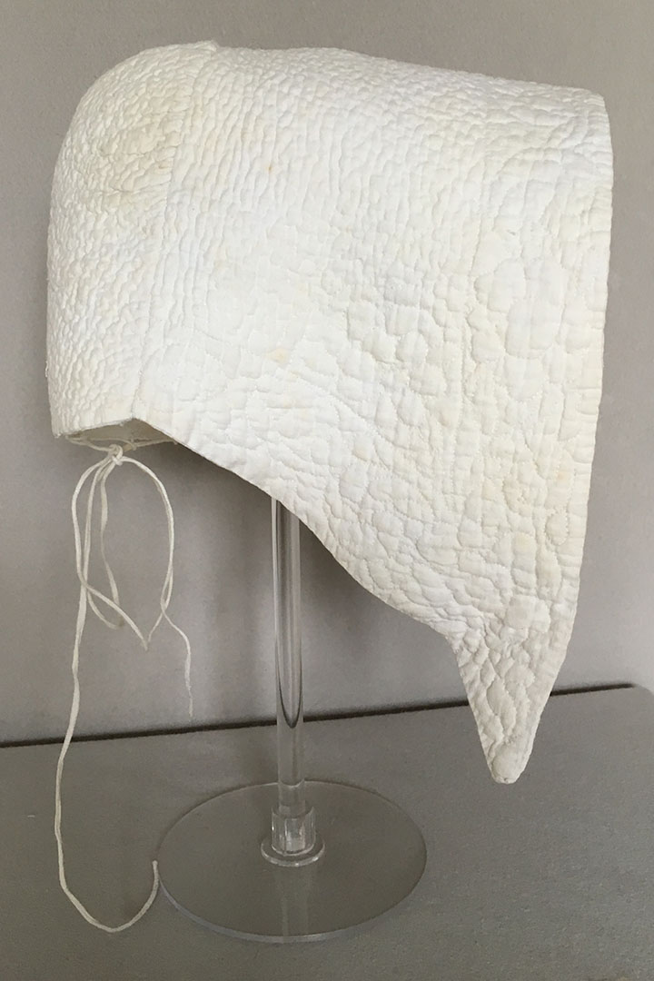 The cap front section with a wide border 2 in; 5 cm quilted with a design starting centre front and changing to the outer corners, with large stylised flowers, within the border a flowerhead at the corners with simple quilting beyond, the back crown with very simple quilting, with large linen corded loops to the base and simple narrow tape for gathering at the neck, the crown very gently gathered into the front section.