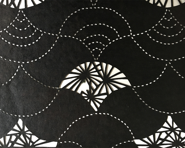 Ise-katagami is the art of making stencils for fabric printing. The art is traditionally centered on the city of Suzuka in Mie Prefecture. Multiple layers of thin washi paper, often from the mulberry tree, are bonded with a glue extracted from persimmon, which makes a strong flexible brown coloured paper. Often used on kimono fabric which is then resist dyed using the stencil.